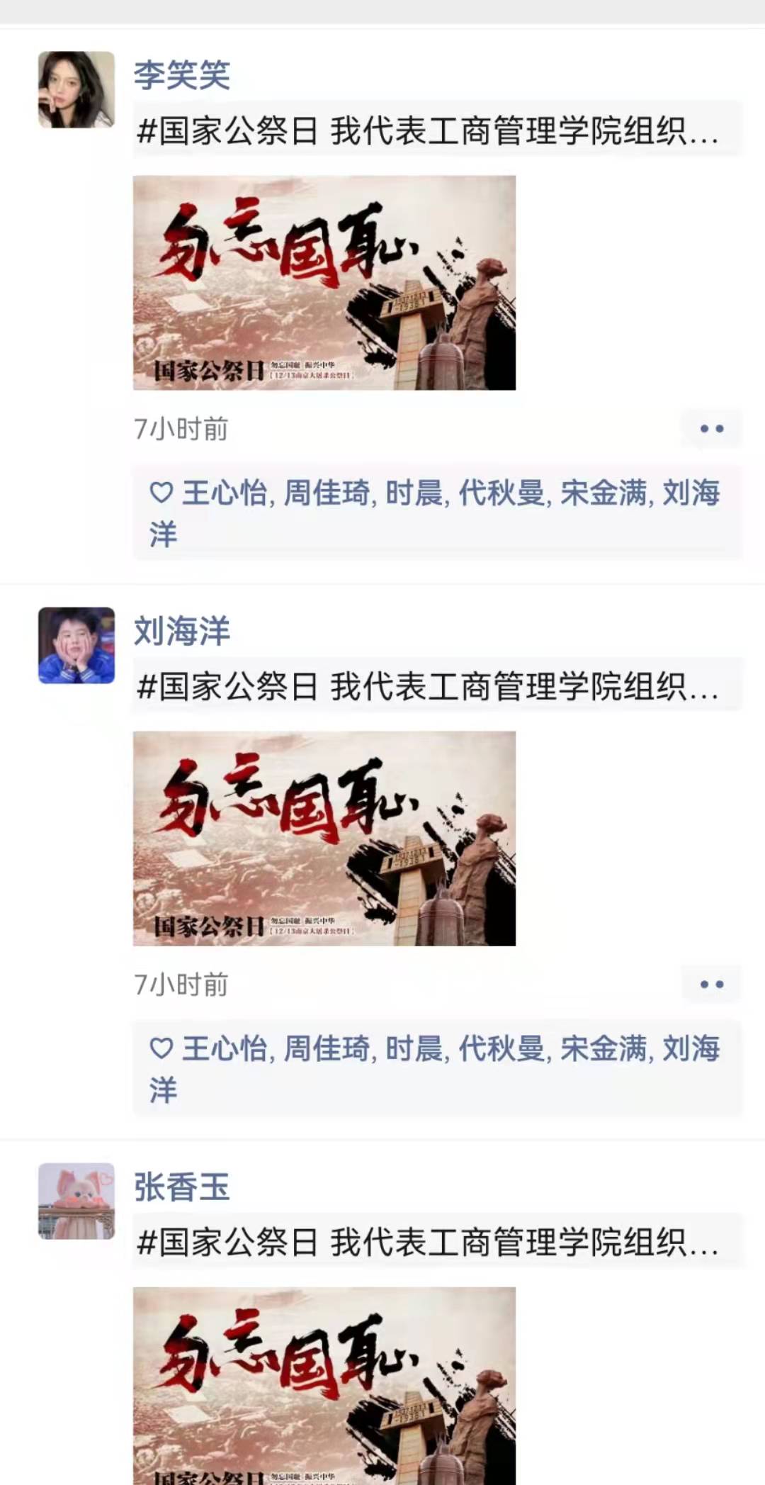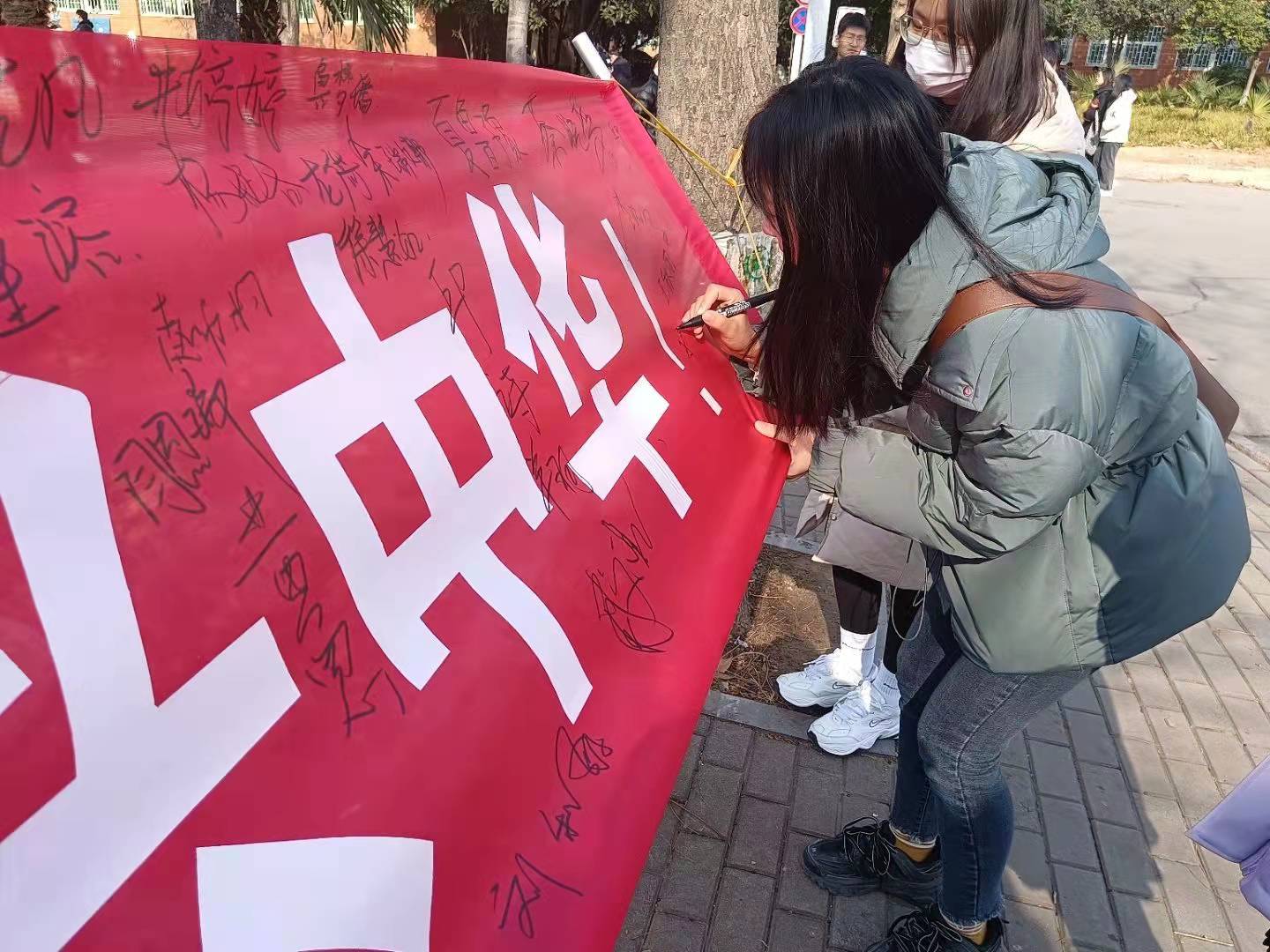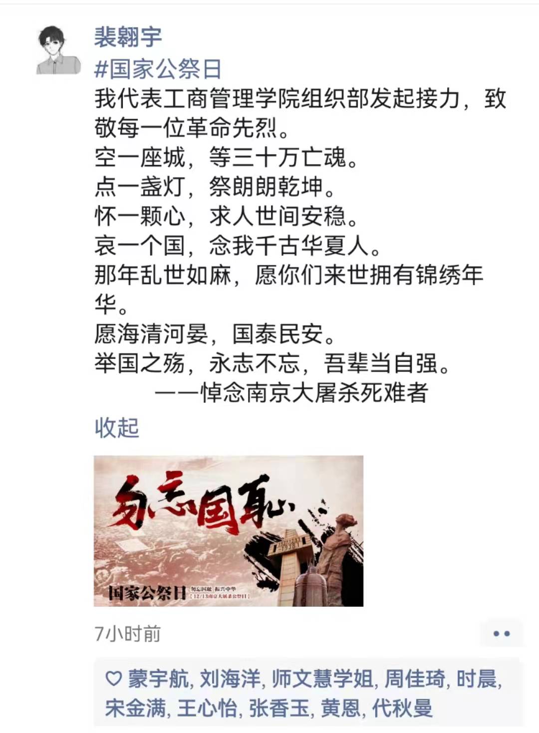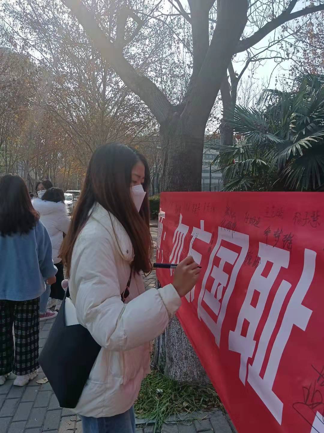 12月13日凌晨,必赢565net官网团学会组织部在微信朋友圈纷纷发起“不忘公祭日,爱国有我在”红色传承接力活动,用这种方式深切表达对南京大屠杀遇难同胞的哀悼,激励广大青年铭记历史、担当使命;中午,生活权益部在红色花蕊和六号宿舍楼下挂起横幅,开展以“铭记历史,勿忘国耻”为主题的宣誓签名活动。每位同学认真的在横幅上签上自己的名字,一笔一划,遒劲有力;一言一行,尽显真挚情感。那一刻,横幅上写的不仅仅是名字,更是对逝者的哀思;那一刻,眼睛里闪烁的不仅仅是泪水,更是挺起祖国脊梁的决心;宣传部,更是手绘公祭日宣传海报,来纪念每一位逝者,反思那一段沉痛的历史,同时在心里默默许下誓言:为中华民族伟大复兴而读书!